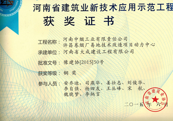 日前,從河南省建筑業(yè)協(xié)會獲悉,由我集團(tuán)公司承建的河南中煙工業(yè)有限責(zé)任公司許昌卷煙廠易地技術(shù)改造工程符合河南省建筑業(yè)新技術(shù)應(yīng)用示范工程驗收要求,經(jīng)河南省住房和城鄉(xiāng)建設(shè)廳研究決定,授予本項目“河南省建筑業(yè)新技術(shù)應(yīng)用示范工程獎”。