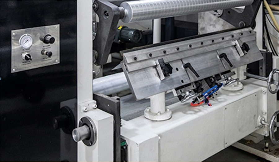 擠壓分切在國內(nèi)分切機上并不常見,它主要是由與材料速度同步并與材料有一定包角底輥和調(diào)節(jié)方便的氣動刀組成。這種分切方式既可以分切比較薄的塑料薄膜,也可以分切比較厚的紙張、無紡布等。是一種比較方便的分切方式。是分切機分切方式的一個發(fā)展方向。